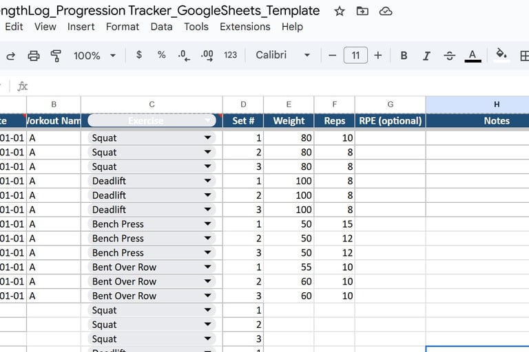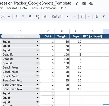 Track your workouts the smart way. Learn how to use a simple Google Sheets strength log to guide progression, build strength, and avoid plateaus.